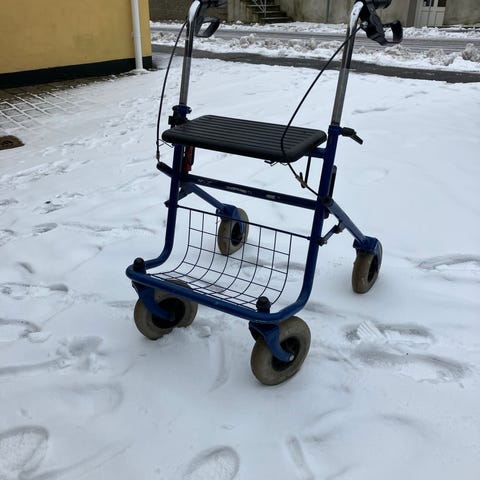 Rollator med polstret sæde og ryglæn i grå. Stel i blå metal med fire hjul og højdejusterbare håndtag med bremser. Under sædet er der en taske/kurv til opbevaring af personlige ejendele. Egnet som ganghjælpemiddel til både indendørs og udendørs brug.