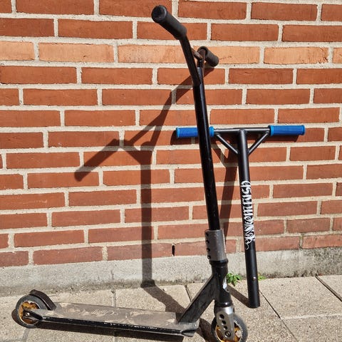 Fint løbehjul med helt nye hjul. Mangler en skrue til baghjulet ellers fejler det intet. Nypris 1.650 kr.