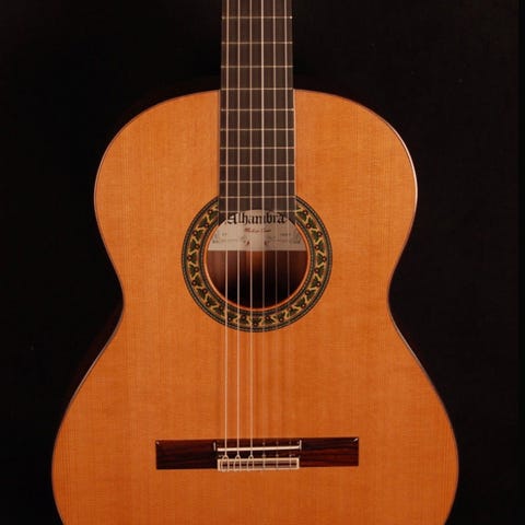 Alhambra 7FC akustisk guitar med cutaway-krop i naturtræ. Klassisk nylonstrenget model fremstillet i Spanien. Kroppen har lys trætop og mørkere sider og bagside. Halsen har gribebræt med traditionelle båndmarkeringer. Guitarens krop har indbygget preamp og equalizer til tilslutning af forstærker eller lydanlæg. Velegnet til klassisk spil, flamenco og generel akustisk brug, både øvning og optræden.