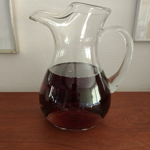 Flot antik glaskande i klar glas med mønstret dekoration. Kanden har hank og hældetud. Regner med det er holmegårds kande. Højde 25 cm, bredde 13,5 cm. Fuldstændig intakt uden skår eller ridser.