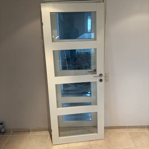 X3 Indvendig glasdør i hvidmalet træ med tre rektangulære glasfelter. Døren har indbygget låsekasse og greb i metal. Velegnet som indvendig dør mellem rum, hvor der ønskes lysgennemgang. På nederste del af døren ses mindre borehuller i overfladen.