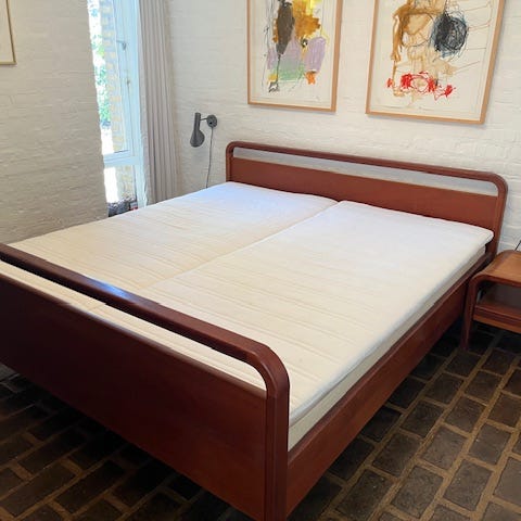 Fin dobbeltseng i eg, med to individuelle madrasser i træramme. To sengeborde medfølger.