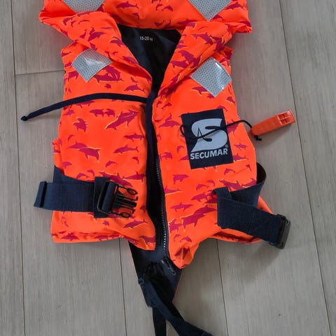 Secumar Bravo Print redningsvest til børn med vægtinterval 20-30 kg. Passer til et brystmål på ca. 71-76 cm. Udstyret med lynlås, justerbare remme og fløjte. Brugt få gange og fremstår som ny. Har også en til salg i vægtinterval 15-20 kg.