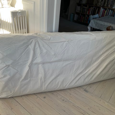 Skårer box-madras fra IKEA betrukket med tyk, stærk kvalitetsuldstof fra KVADRAT i en smuk, dyb blå farve.