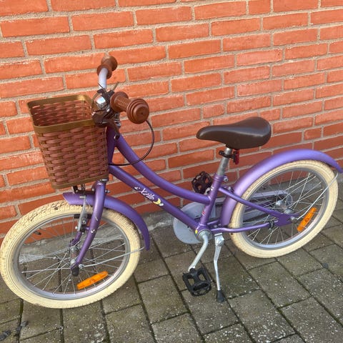Pige cykel med 18" hjul i lilla farve. Cyklen har kurv foran og bagagebærer bagpå. Udstyret med støtteben og skærme. Uden lygter og lås. Lidt ryst og afskalning enkelte steder, kurv noget bøjet (se billeder)