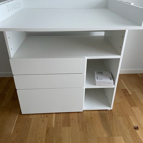 IKEA puslebord med opbevaring i hvid. Puslebordet har en stor pusleflade med kant rundt om bagkant og sider. Under puslepladen er der skabe, åbne rum og skuffer, som giver god plads til opbevaring af bleer, tøj og tilbehør. Velegnet til brug på børneværelset eller i soveværelset som funktionelt puslemøbel med integreret opbevaring.
