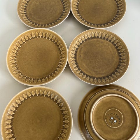 Gul relief underkopper keramik. Sættet består af seks tallerkener med dekoreret kant og ensartet glasur.