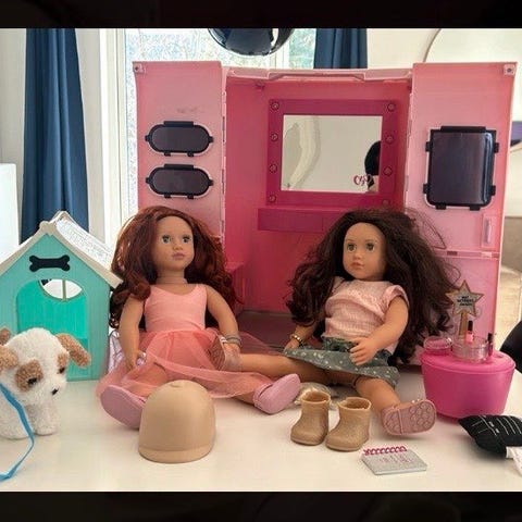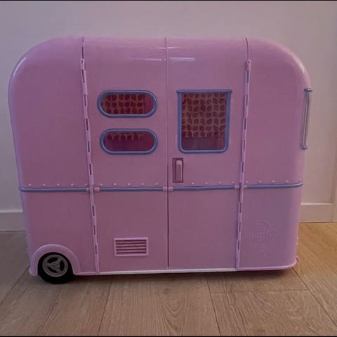 Sælger dette flotte Our Generation sæt bestående af den røde 4x4 jeep (“My Way & Highways”) og den store sølv campingvogn (“R.V. Seeing You”). Passer til 18-tommer dukker, fx Our Generation og American Girl.