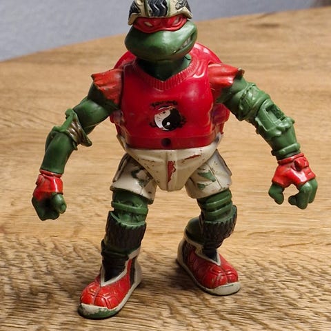 Teenage Mutant Ninja Turtles figur, Raphael fra 2002. Figuren er mærket med årstal og Mirage Studios Playmates Toys.