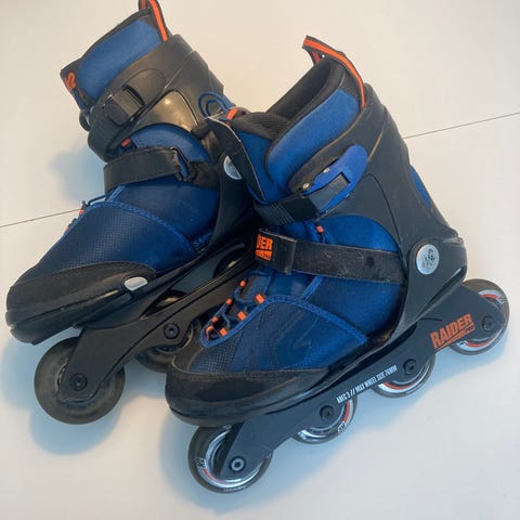 K2 Raider rulleskøjter i blå med sort stel. Justerbar model med klikspænde, velcrostrop og snørelukning for stabil pasform. Fire hjul på hvert stel, egnet til brug på asfalt og andre jævne underlag. Velegnet som inliners til børn eller begyndere i rulleskøjteløb.