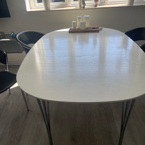 Spisebord med to tillægsplader på 45 cm hver. Få brugsspor. Fremstår pæn.
