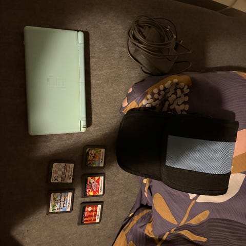 Nintendo DS konsol i sort. Den er soft modded med en R4SDHC DS kort, som har en 8GB TF kort koblet til.