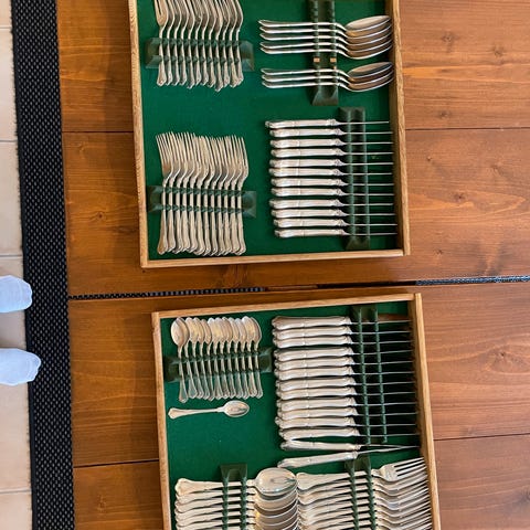 Lotus tretårnet sølvbestik til 12 personer - 96 dele. Fra Horsens Sølvvarefabrik og knivene med Raadvad rustfri knivblade. Fin stand.