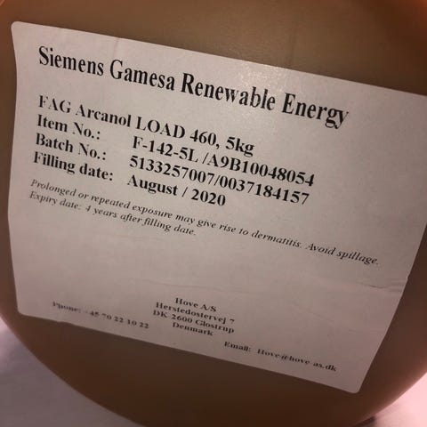 5 kg beholder med FAG Arcanol LOAD 460, et specialiseret smørefedt produceret til Siemens Gamesa Renewable Energy.