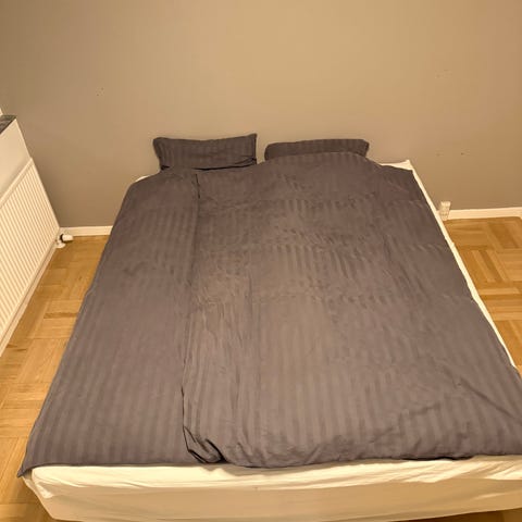 IKEA seng med madras i lysegrå farve. Sengeb er medium blød og vildt god at sove i.