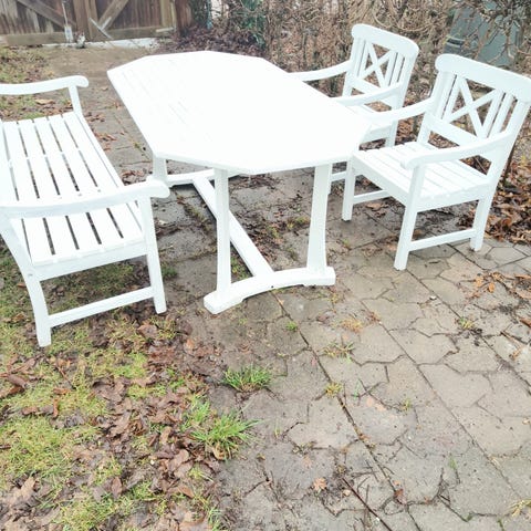Møblerne er ca. 1/2 år gamle. Det hele er i rigtig pæn stand. Enkelte steder er malingen sprunget fra. (se billede). To ubrudte bøtter original maling fra Skovshoved til løbende udbedring.