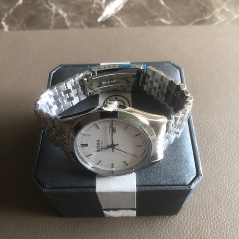 Sector armbåndsur til kvinde med sølvfarvet urskive og markeringer. Uret har metalrem i sølvfarvet rustfrit stål med foldelås. Analog visning med time-, minut- og sekundviser samt datovisning. Egnet som hverdagsur eller til mere formelt brug.