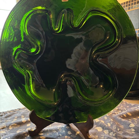 Smukt, stort Ikebana fad i mørkegrønt, næsten sort, glas. Er skål og lysestage - blomsterfakir - designet af Michael Bang for Kastrup Holmegaard. Intakt, med små brugsspor.