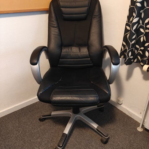 Robust kontorstol med rødt betræk.