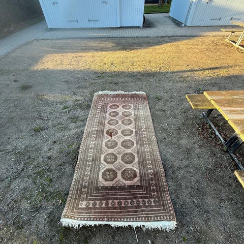 Tæppe, gulvtæppe, afghansk tæppe, Afghansk tæppe / gulvtæppe. Tæppet har ligget sammenrullet siden vi fik det i 1971. Der mangler frynser i det ene hjørne (se foto)