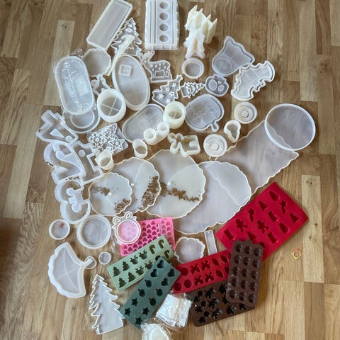 En masse forskellige silikone forme. De små er gode til resin eller til små figurer i lys eller sæbe og de store kan ellers bruges til stearinlys eller sæbe. Enkelte har været brugt før til enten stearinlys eller resin, men alle kan stadig blive brugt igen.