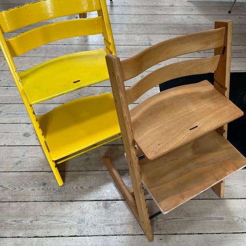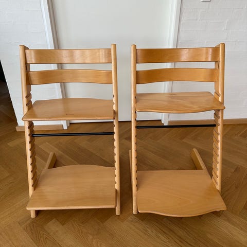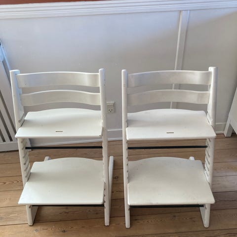 2 stk. Triptrap højstole i hvid. Klassisk træhøjstol med justerbar siddeplade og fodplade, som kan tilpasses barnets højde. Der er brugsspor på begge men det ene er mere slidt end det andet.