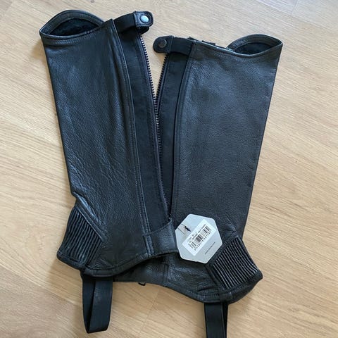 Læder chaps i brun farve i størrelse S. Modellen har bælte med spænde i taljen og remme til fastgørelse om benene. Sættet inkluderer et matchende bælte eller pyntestykke med frynser. Egnet som ride- eller westerninspireret beklædning, hvor der ønskes ekstra beskyttelse over bukserne.