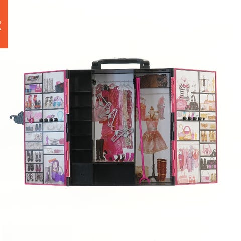 Barbie garderobeskab dukketilbehør i pink plast med flere rum, hylder og bøjlestang til opbevaring af Barbie-tøj og småting. Skabet har dobbeltdøre og spejle indvendigt. Medfølgende tilbehør omfatter forskellige kjoler, sko, tasker og små accessories til Barbie-dukker. Velegnet som opbevaring og legemiljø til standard Barbie-dukker i mode-serien.