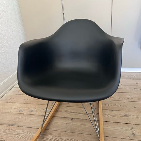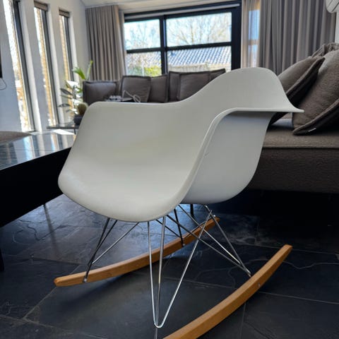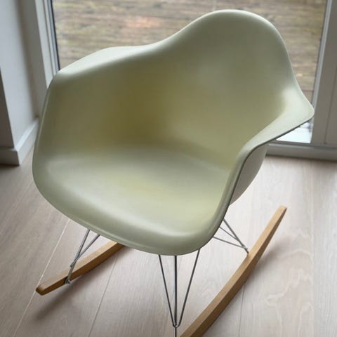 Eames gyngestol, gulnet pga. sol. Stel og skal fejler ellers ikke noget
