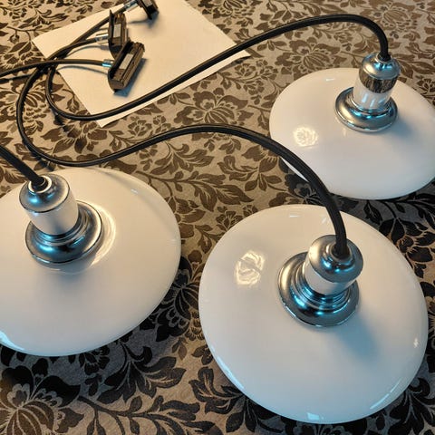 Lampen er monteret med sort stofledning og der medfølger baldakiner med..