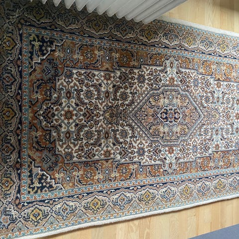 Dette stor tæppe passer godt til et spisebord så alle stole kan stå på tæppet også når man trækker stolen ud. Tæppet er brugt men kan ikke slides ned.
