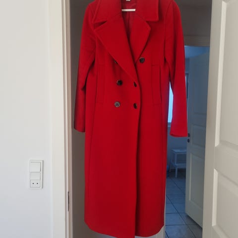 Mørkegrøn lang frakke m/kuskeslag og aftagelig pelshætte-60% Bommuld+40% Nylon