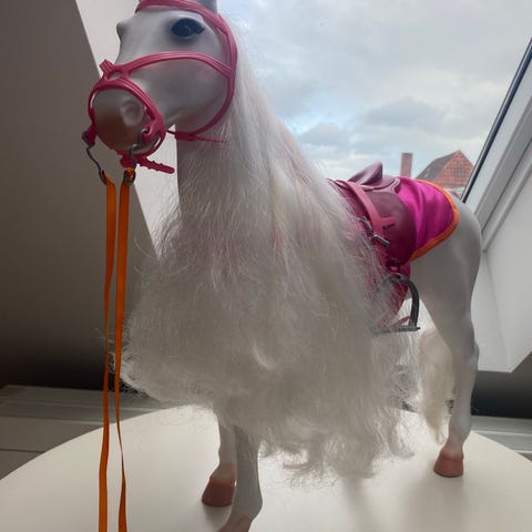 Med saddel, saddeltæppe, “benvarmere”. Sølvglimtende man og hale. Tilbehør er: Spand med æbler, spejl, seks, redekam, pose med havre, pose med godbidder.