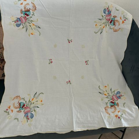 Påske dug helt ny, Måler 85 x 85cm. Meget fin i gennemsigtig materiale med de fineste gule blomster broderet derpå. Stadig i original