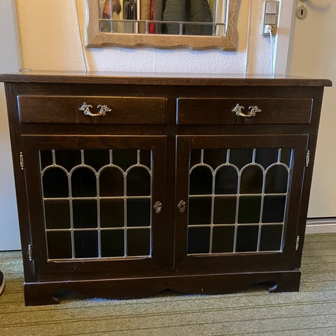Sælger denne upcyclede, rummelige og farverige skænk med det fineste harlekin-spejl.