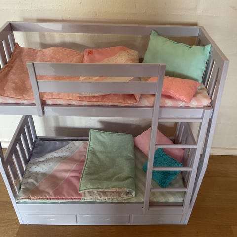 Hyggelig køjeseng til dukkerne. Alt sengetøj på billederne medfølger. H: ca. 54, b ca. 55 cm. Sendes gerne for købers regning.