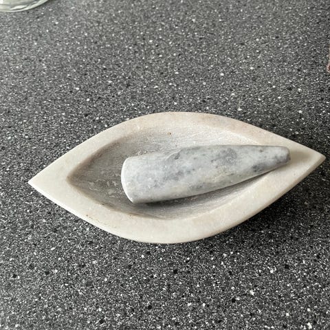 Kraftige og dekorative mortere i massiv marmor, købt i Provence.