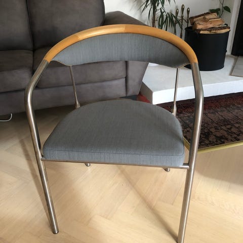 Otte stabelbare armstole Af Thore Lassen & Søren Nielsen. med lameller og armlæn af massivt ahorn, stel af forkromet metal, sæde betrukket med sort møbelstof. Sh. 46 cm. Fremstillet hos Radius Randers, model Rail. Fremstår med brugsspor og ridser. Men generelt i rigtig god stand.. kan stables op til 8 stole.
