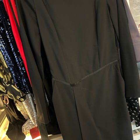 Bruuns Bazaar kjole til hverdag eller fest i sort uldblanding str. 38. Kjolen er ærmeløs med rund halsudskæring foran og V-udskæring bagpå. Den har en enkel, figursyet pasform med synlige søm- og skæringsdetaljer og en kort slids bag på. Materialet er uldblanding som giver en fast og let struktureret overflade. Super enkel sort kjole til arbejde eller fest, kun brugt ganske få gange, da den er lidt for lille.