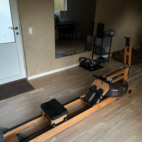 Ascendic 6001 romaskine i egetræ. Vandmodstand med vandtank for jævn ro-bevægelse. Træramme i egetræ med skinne og sæde, fodstøtter med remme samt håndtag for rotræk. Egnet til indendørs træning af kondition og styrke, kan bruges i hjemmet eller i mindre træningsrum.