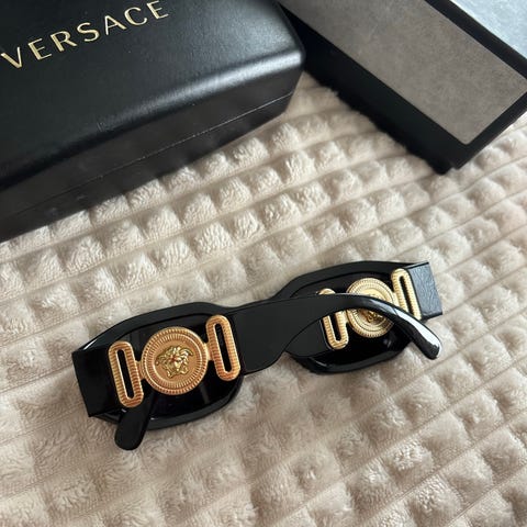 Versace solbriller til unisex i sort. Modellen har polariserede glas, som reducerer genskin. Stellet er i sort med gulddetaljer ved hængslerne. Brillen leveres med originalt Versace-etui og pudseklud, som ses på billederne. Velegnet som solbrille til daglig brug for både mænd og kvinder.