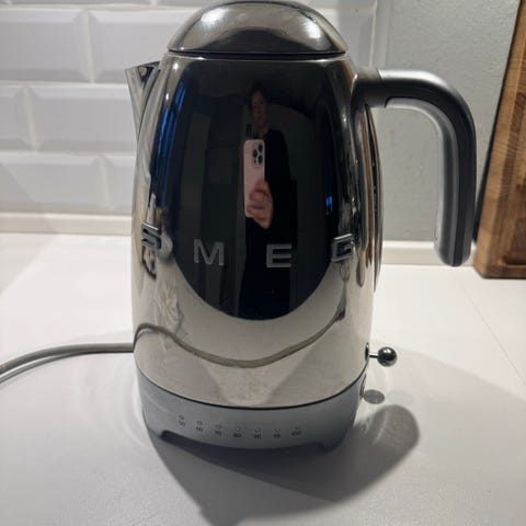 Smeg kedel i rustfrit stål med hvid hank og hvid detalje ved tud. Kanden har blank metaloverflade med Smeg-logo på siden og er udformet som en klassisk fløjtekedel til opvarmning af vand. Velegnet til brug på komfur, afhængigt af kompatibilitet med kogepladetype. Indholdskapacitet og modelbetegnelse fremgår ikke af oplysningerne og bør kontrolleres på emballage eller brugsanvisning.