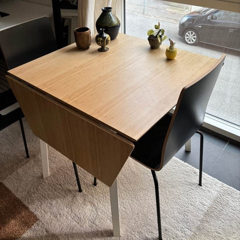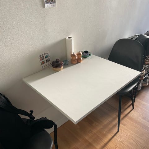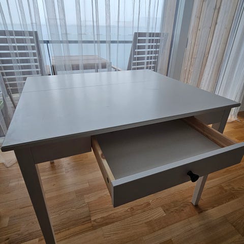 SOLGT 2 Norden spiseborde fra Ikea i hvid. Med opbevaringsskuffer. Kan klappes sammen, så det fylder minimalt. Meget solidt og dermed også forholdsvis tungt.