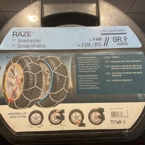 Raze GR.9 KNS90 snekæder til personbil. Leveres i plastkuffert med håndtag for nem opbevaring og transport. Sættet indeholder to snekæder med stålkæder og farvekodede dele til montering. Velegnet til brug på sne- og isdækkede veje på kompatible dækstørrelser som angivet på emballagen.