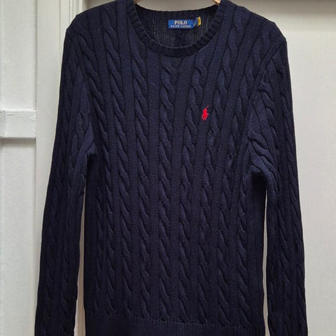 Ralph Lauren Polo striktrøje til herre i størrelse S. Trøjen er blå med kabelstrik-mønster og har det karakteristiske broderede Polo-logo på brystet. Rund hals med ribkant samt ribkanter ved ærmer og forneden. Velegnet som hverdagsstrik eller som ekstra lag over skjorte eller T-shirt.