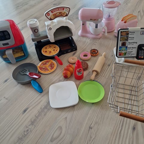 legekøkken tilbehør sæt med blandet legetøjsmad og køkkenredskaber. Sættet omfatter forskellige plastikmadvarer som frugt, grøntsager, brød, kager, pizza, fisk og dåsemad samt køkkenredskaber som piskeris, kageruller, bageforme, bakker og skåle. Der medfølger også en legetøjs-kasseapparat. Egnet til leg i legekøkken eller butik. Plastdele og enkelte dele i træ og metal. Velegnet til børn, der leger rolleleg omkring madlavning og indkøb.