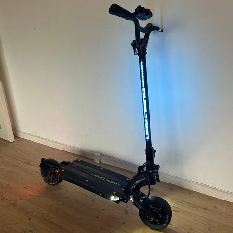 Elektrisk longboard med fire store terrængående hjul og lang, stabil carbon fiber deck-konstruktion.