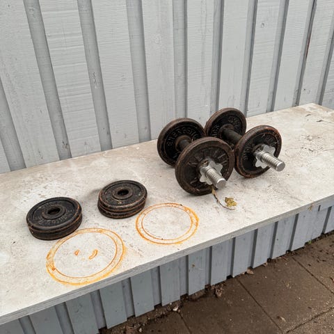 Håndvægte - 4 vægtstænger i alt og med forskellige vægtskiver i to plastkuffert + løse vægtskiver i plast.