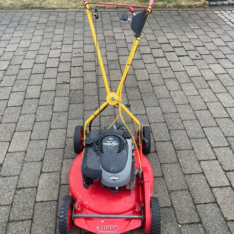 Klippo Triumph plæneklipper med benzinmotor. Modellen har fire hjul og håndtag i metal. Klipperen er rød med sort motorhus. Velegnet til klipning af almindelige græsplæner. Oplysninger om klippebredde, effekt og andre tekniske data fremgår af typeskiltet på maskinen.