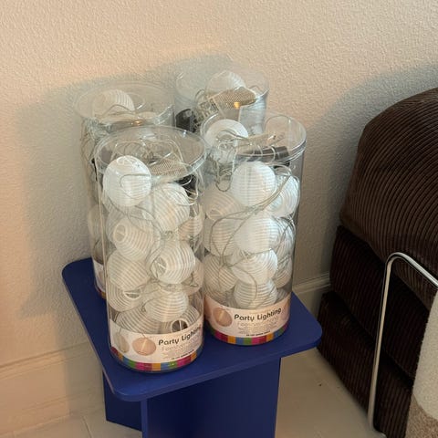 Små rislamper til havefest. Brugt til pynt ved konfirmation. Der er 20 pæne og 6 misfarvede, fordi de har fået regn. Alle virker. 50 kr for alle. (Obs skal afhentes, jeg sender desværre ikke ☺️)